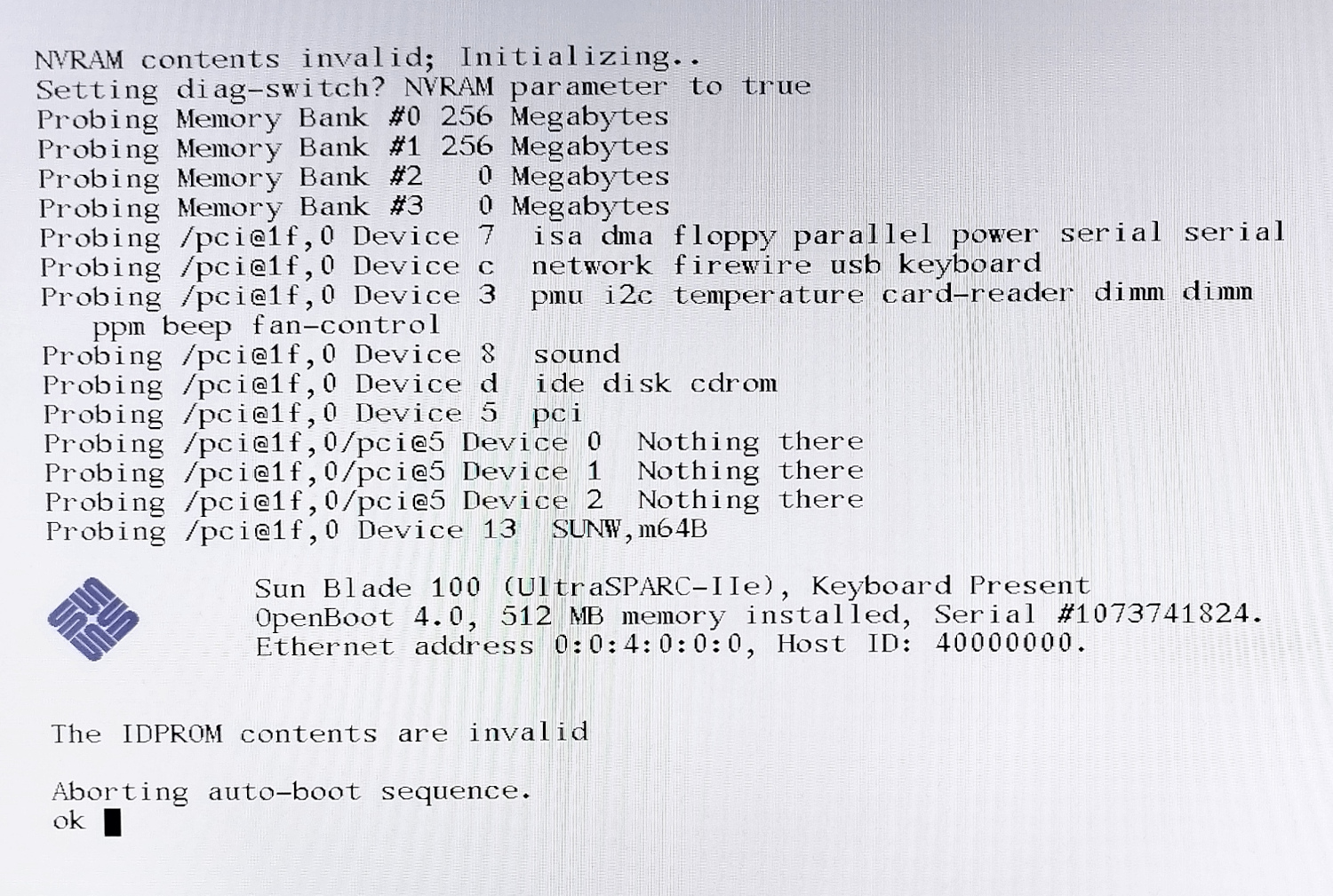 Forgive the Moiré, but this is essentially the first thing I saw when powering up the machine: The IDPROM contents are invalid, the MAC address and Host ID are garbled, the machine gives up booting and we are dropped into the "ok" prompt.