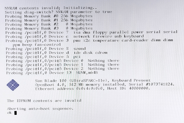 Forgive the Moiré, but this is essentially the first thing I saw when powering up the machine: The IDPROM contents are invalid, the MAC address and Host ID are garbled, the machine gives up booting and we are dropped into the "ok" prompt.